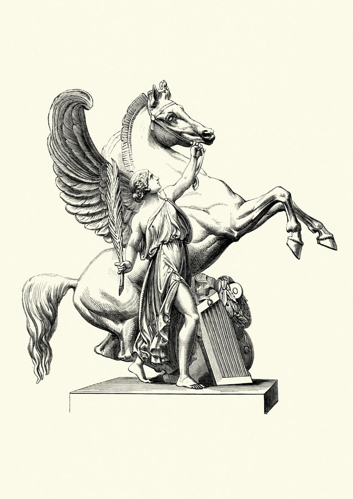 The winged horse Pegasus represents another dimension of this symbolism. Born from the blood of the slain Medusa, Pegasus was not simply a magical creature but a figure of inspiration and transcendence. When Pegasus struck the ground with his hoof, a spring of sacred water burst forth. In this image the horse becomes a mediator between worlds, releasing hidden sources of creativity and insight.